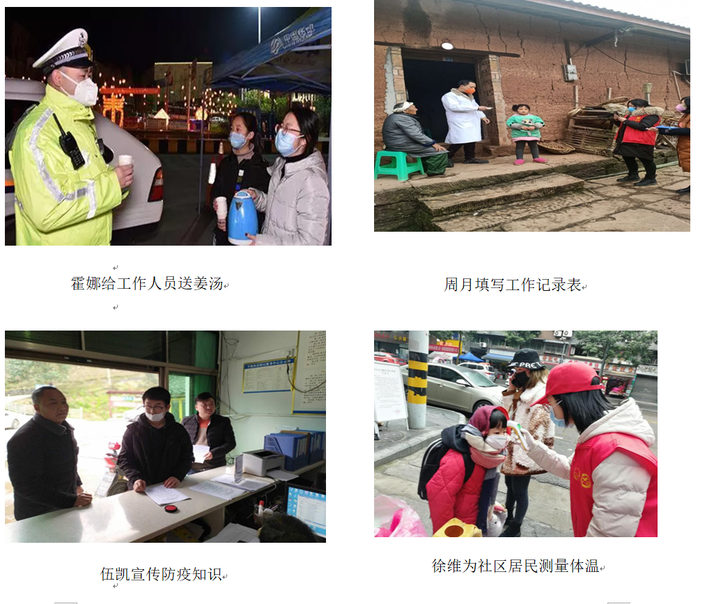 霍娜(研究生)、周月、伍凯、徐维、潘晓娟、吕美怡、徐诗湉、付艺芳、简嫔9名同学主动请缨,在这场没有硝烟的战争中,以实际行动助力社区乡村疫情防控工作:示意停车、为居民测体温、填写登记表格、巡逻劝阻出行人员等,协助社区做好新冠肺炎排查、宣传等工作,有序参与社区防疫工作,成为联防联控群防群控的重要力量。