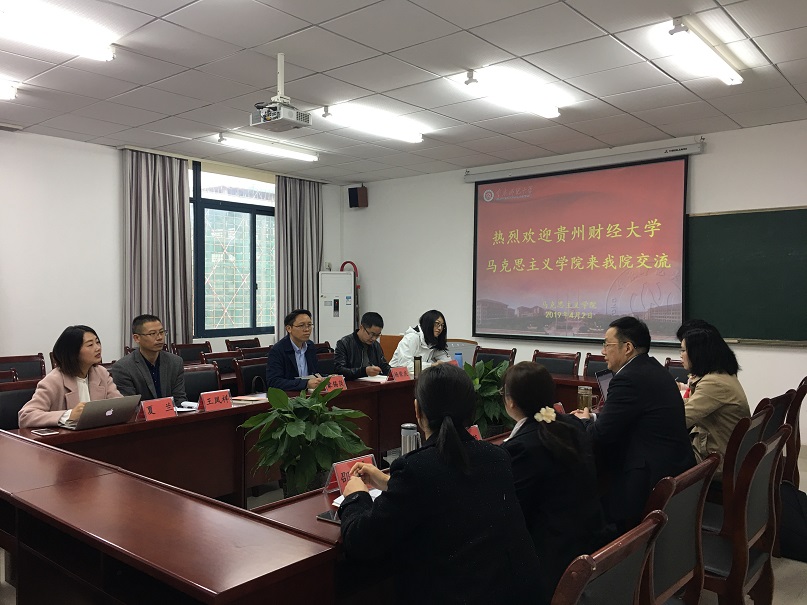 2019年4月2日上午,贵州财经大学绅士漫画 蒙锡岗副院长一行来绅士漫画 进行交流。绅士漫画 党委书记刘军、院长陈洪,思想政治理论课教研部主任孔庆茵、副主任魏冰娥,毛中特教研室主任邵二辉,《高校思想政治理论课实践教学实用教程》主编陈钢,教科办主任张晓庆参加交流。