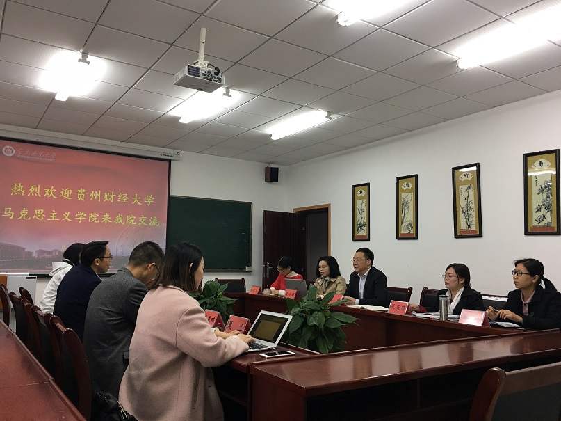 首先,陈洪院长致欢迎词,对贵州财经大学绅士漫画 蒙锡岗副院长和马原理教研室主任常佩瑶、纲要教研室主任杨荣庆、毛中特教研室主任王凤祥、思法教研室主任夏兰等的到来表示热烈欢迎,就绅士漫画 发展历史、学院建设、人才队伍、学科发展、科研平台、文化建设、教学工作、对外交流等方面作了介绍,并着重介绍了绅士漫画 打造“五精课堂”、着力提高课堂教学质量的理念和做法。随后,刘军书记对绅士漫画 “三维五步五课堂”思想政治理论课实践教学模式的改革与创新情况作了介绍。陈钢副教授对绅士漫画 思想政治理论课实践教学的流程和实施情况进行了详细介绍。
