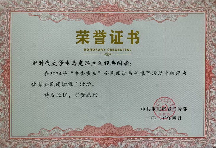 申报的“新时代大学生马克思主义经典阅读”项目,近日在重庆市2024 年“书香重庆”全民阅读系列推荐活动中脱颖而出,获评 “优秀全民阅读推广活动”。这一荣誉不仅是对学院阅读推广工作的高度认可,更是为构建“书香重庆”贡献了重要力量。
