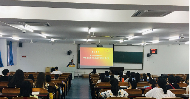 首先,田方林教授以习近平总书记在党的十九大报告中的一段话引题,生动细致地开始了“坚持实事求是的思想方法和工作方法”、“坚持战略定力的思想方法和工作方法”、“坚持问题导向的思想方法和工作方法”、“坚持全面协调的思想方法和工作方法”、“坚持底线思维的思想方法和工作方法”、“坚持调查研究的思想方法和工作方法”、“坚持抓铁有痕的思想方法和工作方法”、“坚持历史担当的思想方法和工作方法”等八个方面的讲述。在课堂中,田方林教授紧扣时事,用幽默风趣的语言多次深入剖析新冠肺炎疫情、中外摩擦等实例,将理论与实际相结合,更将习近平新时代中国特色社会主义思想融入生活,贯穿始终。课堂的最后,田方林教授总结了课程主要内容,并对学生的未来提出了期望。