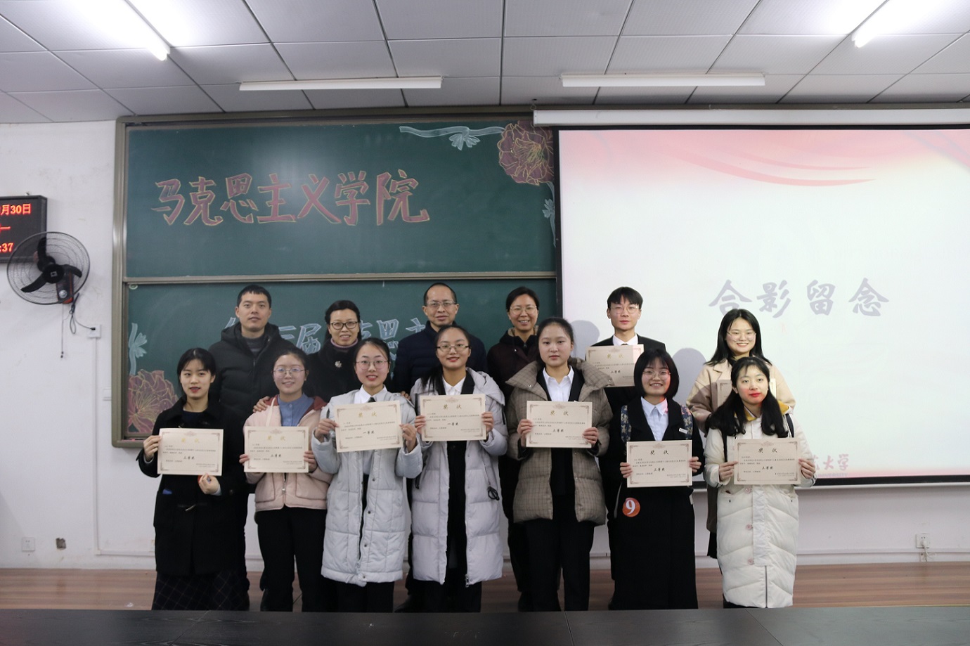 历时一小时四十分钟,所有选手展示完毕。邓淑月、严佳同学荣获一等奖;邓雨、周鹏飞、王志诚同学获得二等奖;徐维、陈岚清、谭玲英、李冰慧、杨婕、丁敬佳等六名同学获得三等奖。评委点评环节,李长泰老师通过列举马克思、毛泽东、习近平读书的例子,提出“大牛都是读经典成长起来”的观点,向在场同学强调了读经典的重要性并呼吁同学们积极阅读经典。随后,在高度赞赏选手们的精彩表现后,李老师也从报告技巧、内容、台风以及选题方面提出了建议,希望选手在以后的经典报告中一是选题应当切合社会主义核心价值观和新时代中国特色社会主义思想理念,二是报告应该聚焦经典本身的意义价值,由点及面剖析经典内容,对于心得体会则是点到重点、点到经典即可。16时20分,评委与选手合影留念,活动圆满结束。