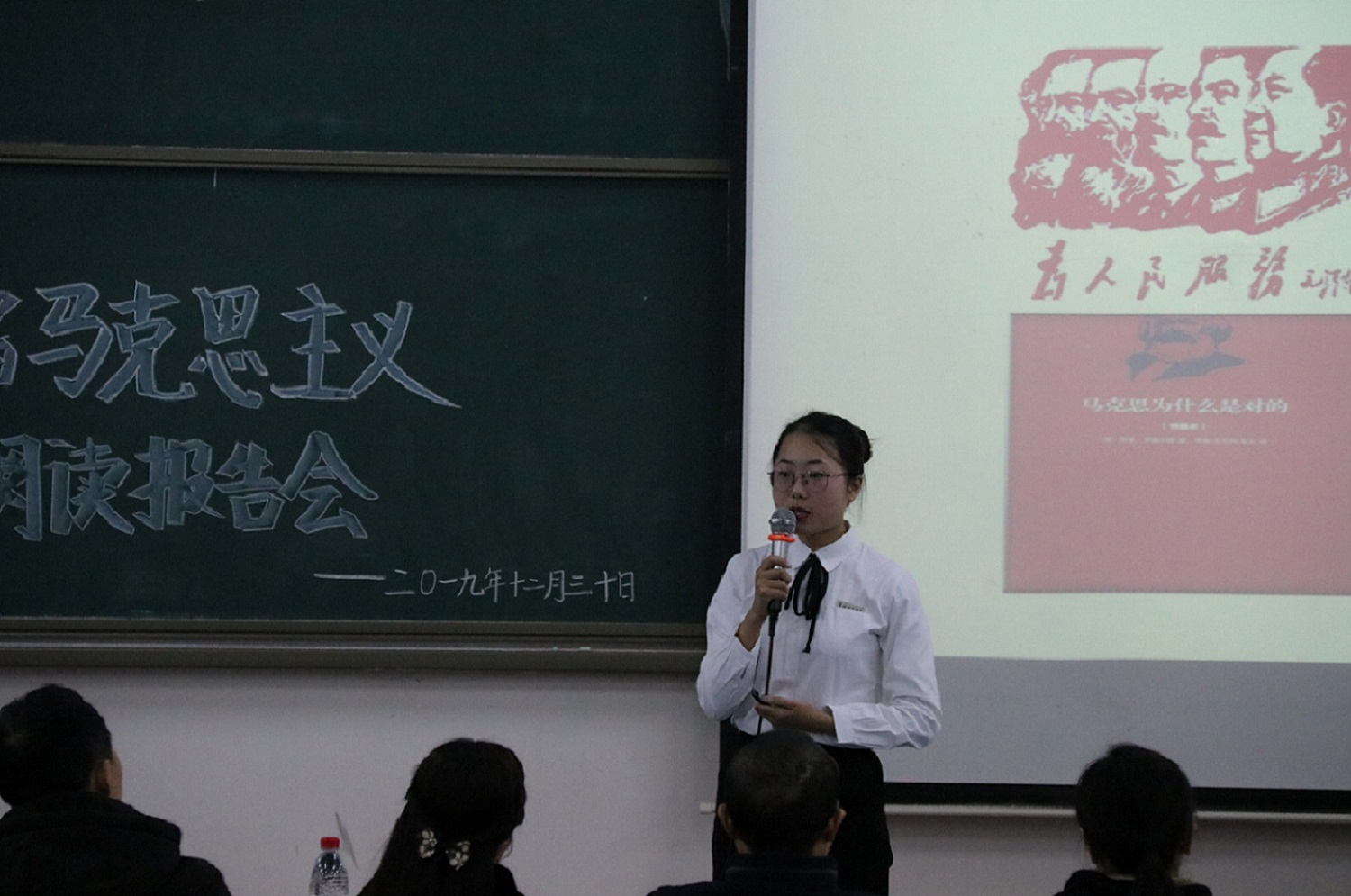 活动开始,主持人介绍了评委并宣布了比赛规则。所有选手都主题鲜明、亮点突出地开展了报告,其中一号选手丁敬佳带来《改造我们的学习》,主要从学习与青年学生成才、成人两方面分享了观点:青年一代必须坚定树立社会主义共同理想和共产主义远大理想,志存高远、脚踏实地,以青春之我、奋斗之我,努力为民族复兴铺桥架路,为祖国建设添砖加瓦,而二号选手邓淑月则从创作背景、主要内容等方面分享了关于《改造我们的学习》的又一见解。十一号选手严佳以“资本主义最终只是一个历史的过渡阶段,它的未来逃脱不了灭亡的结局”为切入点深入浅出地分析了“马克思主义为什么行”的问题,赢得了观众的热烈掌声。