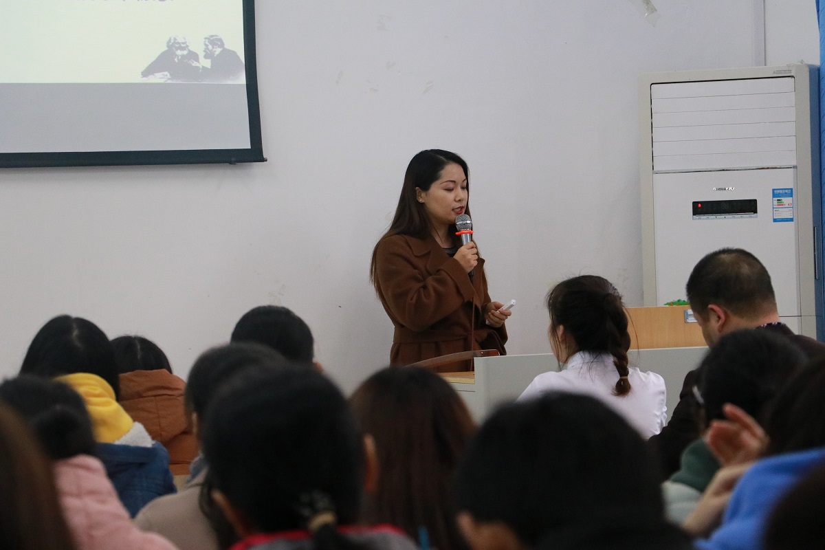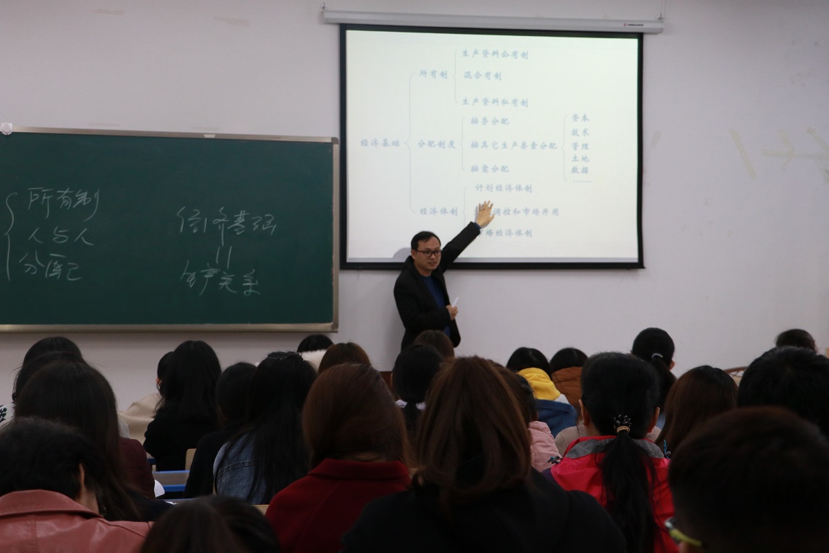 本次活动分为教学示范观摩课和新进教师公开课两大部分。首先,由吕振丽和李洪淑老师分别展示了“马克思主义基本原理”课程中的“经济基础的概念”“联系的概念和基本特征”两堂教学示范观摩课。吕振丽老师以生产关系概念为切入点,运用提问和讲授相结合的教学方法,指出经济基础与经济体制之间的联系与区别,借助逻辑图进一步阐释生产关系、分配制度、生产要素、基本经济制度等概念,点明经济基础的内涵与外延。李洪淑老师由歌曲“我和我的祖国”导入课程,指出每个人都与祖国相依相伴,都同祖国有着不可分割的联系。她借助食物链等经典案例进一步揭示出万事万物都具有普遍联系,进而举例说明了联系具有客观性、普遍性、多样性、条件性的基本特征。