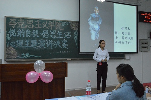 在主持人宣读完规则后演讲比赛正式开始。伴随着轻扬的音乐选手依次上场,每位选手都展现出自己精彩的一面。5号选手易双提到初入大学的迷惘与慌张,再到后来自己迎新时的辛苦与快乐时,抑扬顿挫的语调和恰到好处的肢体语言深深的吸引了在场观众的注意,配合着PPT的讲解,观众们如身临其境。此外,6号选手谭丹和7号选手朱欣雨结合自己的亲身实际为同学们剖析心理问题,并提出克服相关问题的举措,赢得了在场观众和评委的赞赏。