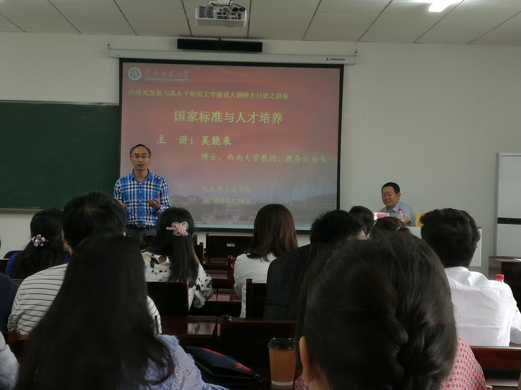 全院教师通过吴能表教授对《国家标准与人才培养》的详细讲解,进一步了解了《普通高等学校本科专业类教学质量国家标准》制定意义,明确了马克思主义理论类教学质量国家标准,明晰了思想政治教育专业培养目标。此次讲座,对学院内涵式发展具有指引作用,对提高思想政治教育专业人才培养质量、积极推进教学改革及不断提高专业教学水平均有积极的意义。