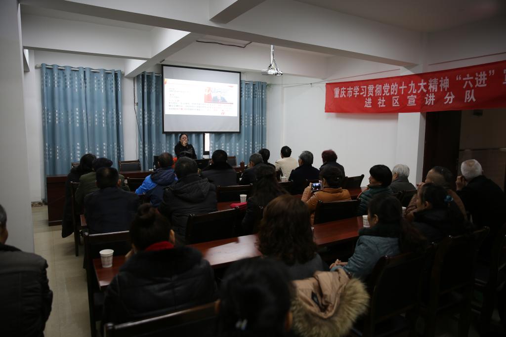 学习宣传贯彻党的十九大精神是当前和今后一个时期的一项重要政治任务,开展党的十九大精神宣讲是高校教师特别是绅士漫画 的教师应尽的责任和义务。201711月中旬—126,我陈洪、王勇、祝玉峰、孔宪峰、周秀红、田方林、赵玉民、孔庆茵、郑瑜、吴涯、王开莉等11教师作为中共重庆市委党的十九大精神“进社区”宣讲团成员,深入重庆市垫江、彭水、秀山、奉节、巫山、酉阳、石柱、万盛、忠县、巫溪、云阳等11区县61社区,以扎实的理论功底、通俗易懂的语言、生动丰富的案例6500余名社区群众宣讲党的十九大精神受到社区群众的欢迎和肯定。区县新闻媒体宣讲团成员的宣讲进行了播报,产生了较好的社会反响。