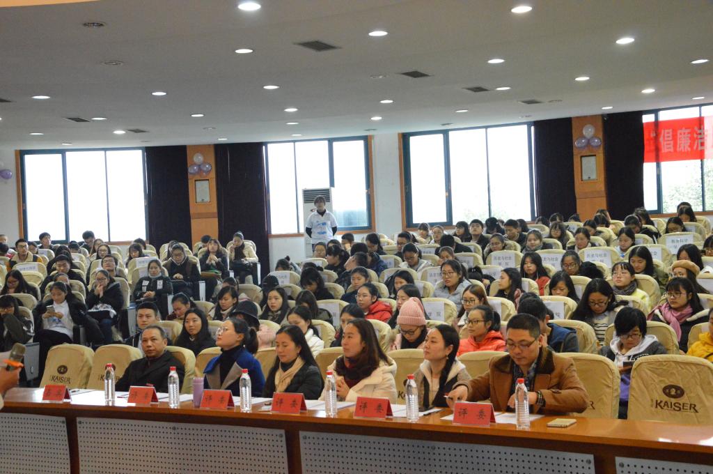 三春湖廉风学社承办。“倡廉洁风气,扬中华精神”廉洁演讲比赛决赛在弘德楼凯撒报告厅举行。本次活动特邀校团委书记毛霞,监察处副处长彭林,国际汉语文化教育管理办公室副主任左金隆,外国语学院党委副书记、纪委书记钟敏,音乐学院党委副书记、纪委书记文琪,纪委监察处正科级纪检监察员、三春湖廉风学社指导老师戴杰担任本次活动的评委。
