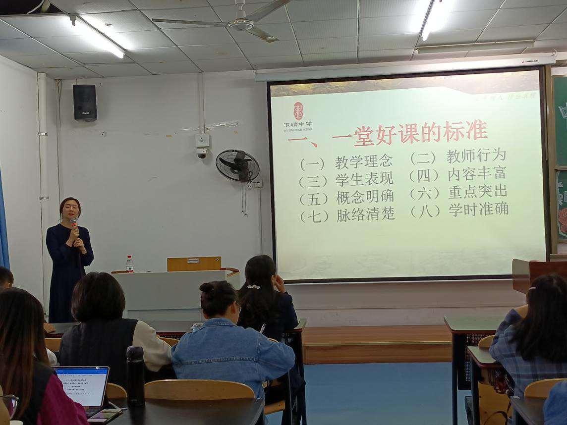 其次,代老师指出衡量一堂好课的标准有八个方面。第一,始终坚持以生为本的教学理念,坚持以学生的可持续性发展为主;第二,教师行为举止得体,语言生动精炼;第三,课堂气氛活跃,学生踊跃参与;第四,教学内容丰富,具有科学性和先进性;第五,概念明确,有利于学生理解知识;第六,教学重点突出,运用多种教学手段深化知识;第七,教学设计脉络清楚,符合逻辑;第八,学时明确,精心安排教学过程。之后,代老师播放2018年9月市级骨干教师指导课《用联系的观点看问题》,指出教师在教学中采用体验式教学模式,促进学生领会和运用知识。