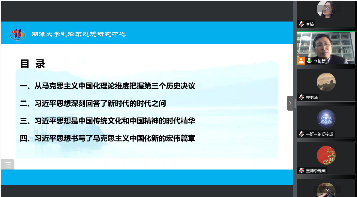 为深刻理解习近平新时代中国特色社会主义思想实现了新的飞跃,李佑新教授围绕主题从四个方面作了全面系统的阐释:一是从马克思主义理论创新维度把握第三个历史决议;二是从现实实践的维度来看,习近平新时代中国特色社会主义思想是对新时代的时代之问的回答;三是从继承发展传统文化来看,习近平新时代中国特色社会主义思想是对中国传统文化的创造性转化和创新性发展的典范,是中国传统文化和中国精神的时代精华;四是从马克思主义理论创新来看,习近平新时代中国特色社会主义思想书写了马克思主义中国化新的宏伟篇章,是当代中国马克思主义、21世纪马克思主义。