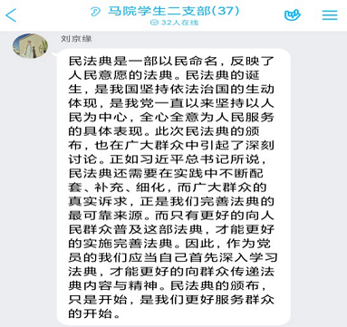 学生二支部委员会开展线上主题党日活动,活动包括两项议程:一是以“悟初心使命”毕业生党员主题活动及经典文献阅读,二是学习《民法典》谈心得感悟。参加本次会议的人员有中共绅士漫画