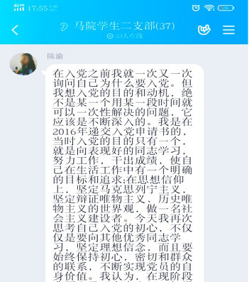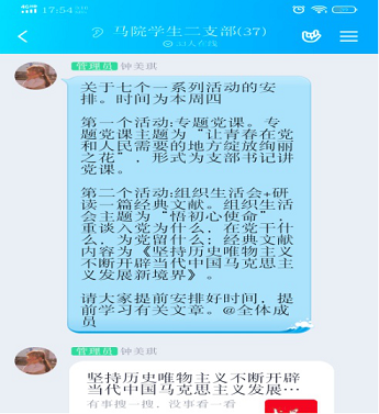 学生二支部委员会开展线上“七个一”毕业生教育实践活动,活动分为三个部分:支部书记讲党课、党员重温“入党为什么、在党干什么、为党留什么”、经典文献阅读分享。学生二支部全体党员参加本次教育实践活动,活动由周耀玫同志主持。