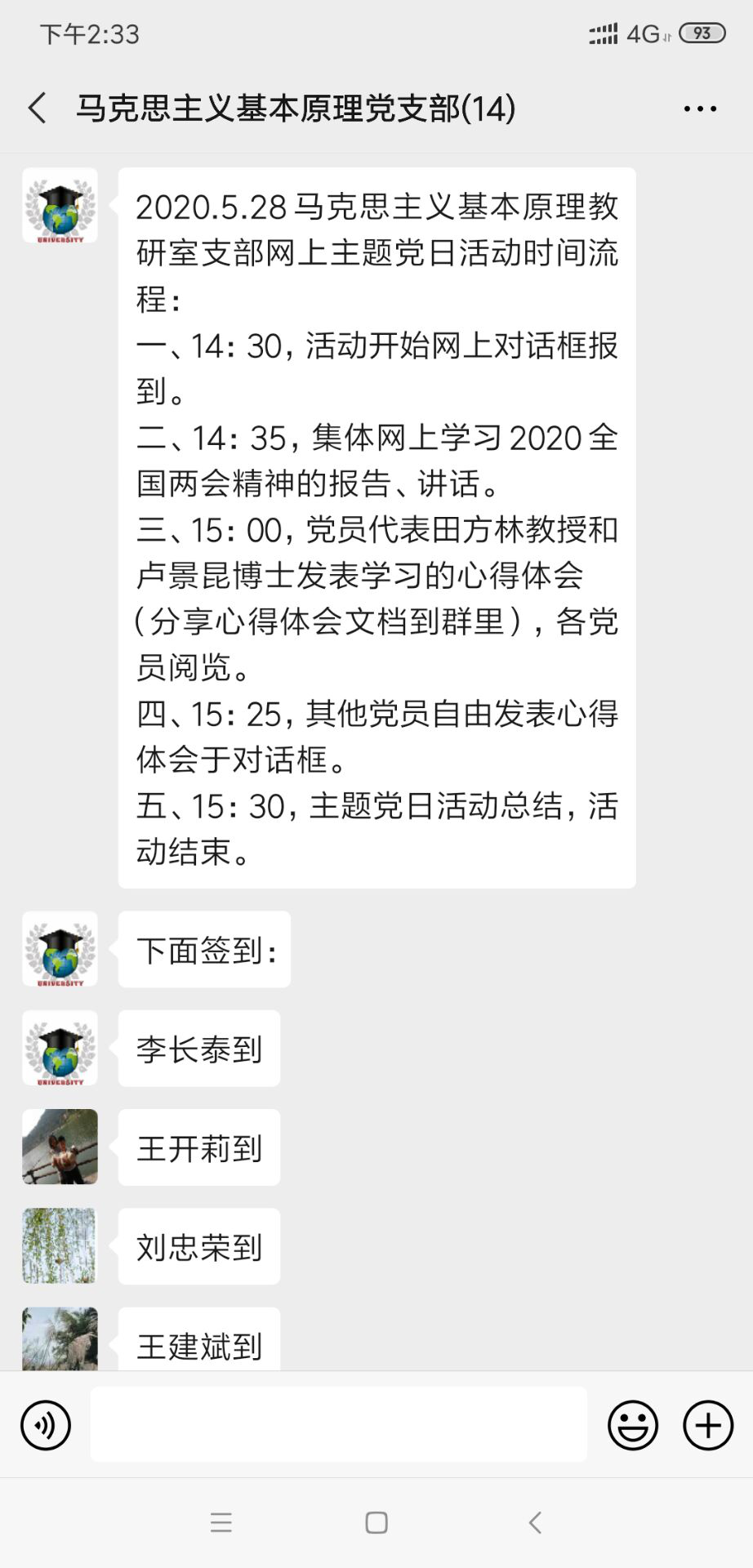 马克思主义基本原理概论教研室支部下午在微信支部群中开展了以学习贯彻2020年全国“两会”精神主题党日活动,马基原教研室党支部全体党员参加会议。