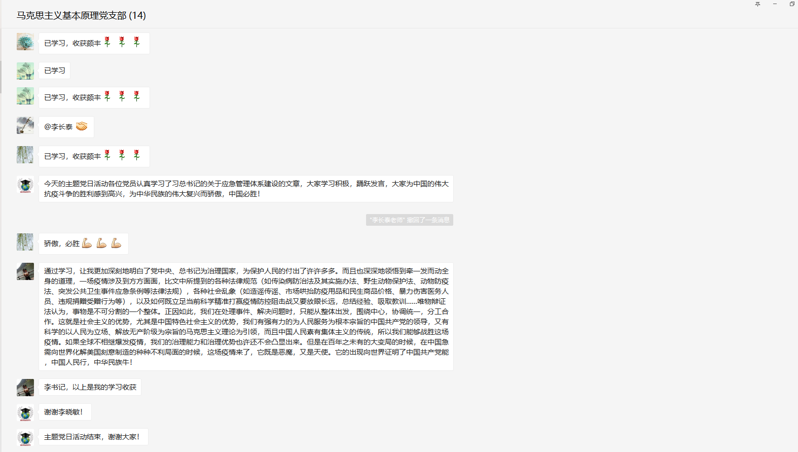 会议由支部书记李长泰教授主持,支部全体党员同志参加了此次交流。李长泰教授首先带领大家学习了“全面提高依法防控依法治理能力,健全国家公共卫生应急管理体系”重要文章,他指出应急管理体系建设主要包含法制范围内的应急管理体系和全方面范围下的应急管理体系。随后,支部党员畅所欲言,大家纷纷表态,一致认为,这次新型冠状病毒肺炎疫情是新中国成立以来防控难度最大的一次重大突发公共卫生事件,习近平总书记的重要讲话明确了健全国家公共卫生应急管理体系的总体原则、重点思路、重要举措,为坚决打赢疫情防控阻击战指明了方向。作为高校思政理论课教师党员,我们既要切实提高政治站位,把思想和行动统一到习近平总书记重要讲话精神上来,更要把抗击疫情精神落实到大学生思想政治教育中,上好这堂别开生面、凝聚人心的育人课。