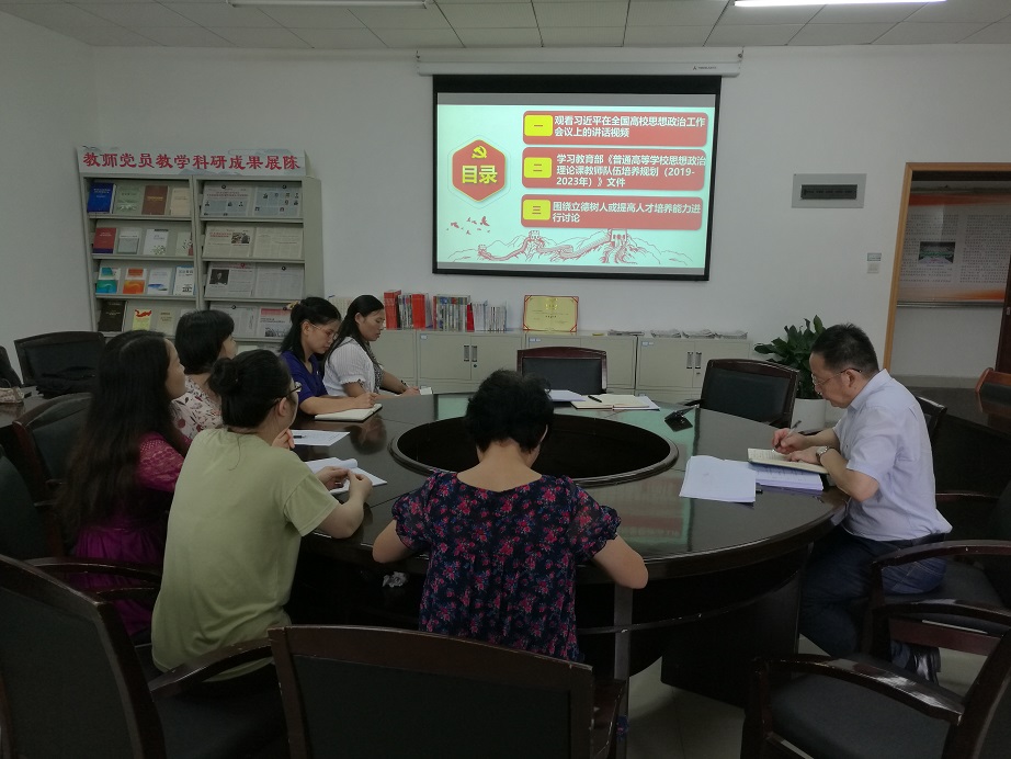 本次主题党日活动的开展形式是支部书记讲党课,主题为《立德树人根本任务“大学习、大讨论、大落实”》,学习内容由三部分组成。首先,全体同志一起观看短视频——习近平在全国高校思想政治工作会议上的讲话。紧接着,黄正书记解读教育部《普通高等学校思想政治理论课教师队伍培养规划(2019-2023年)》文件精神,并根据文件指导思想和工作目标,重点介绍了其中的四个培养途径,即专题理论轮训计划、示范培训计划、项目资助计划、宣传推广计划。最后,大家围绕立德树人和提高人才培养能力进行讨论。同志们一致认为:“学高为师,身正为范”是对教师职业的基本要求,做为高校教师,必须有高尚的道德情操,同时应有扎实的专业知识,潜心为学生传道授业解惑。