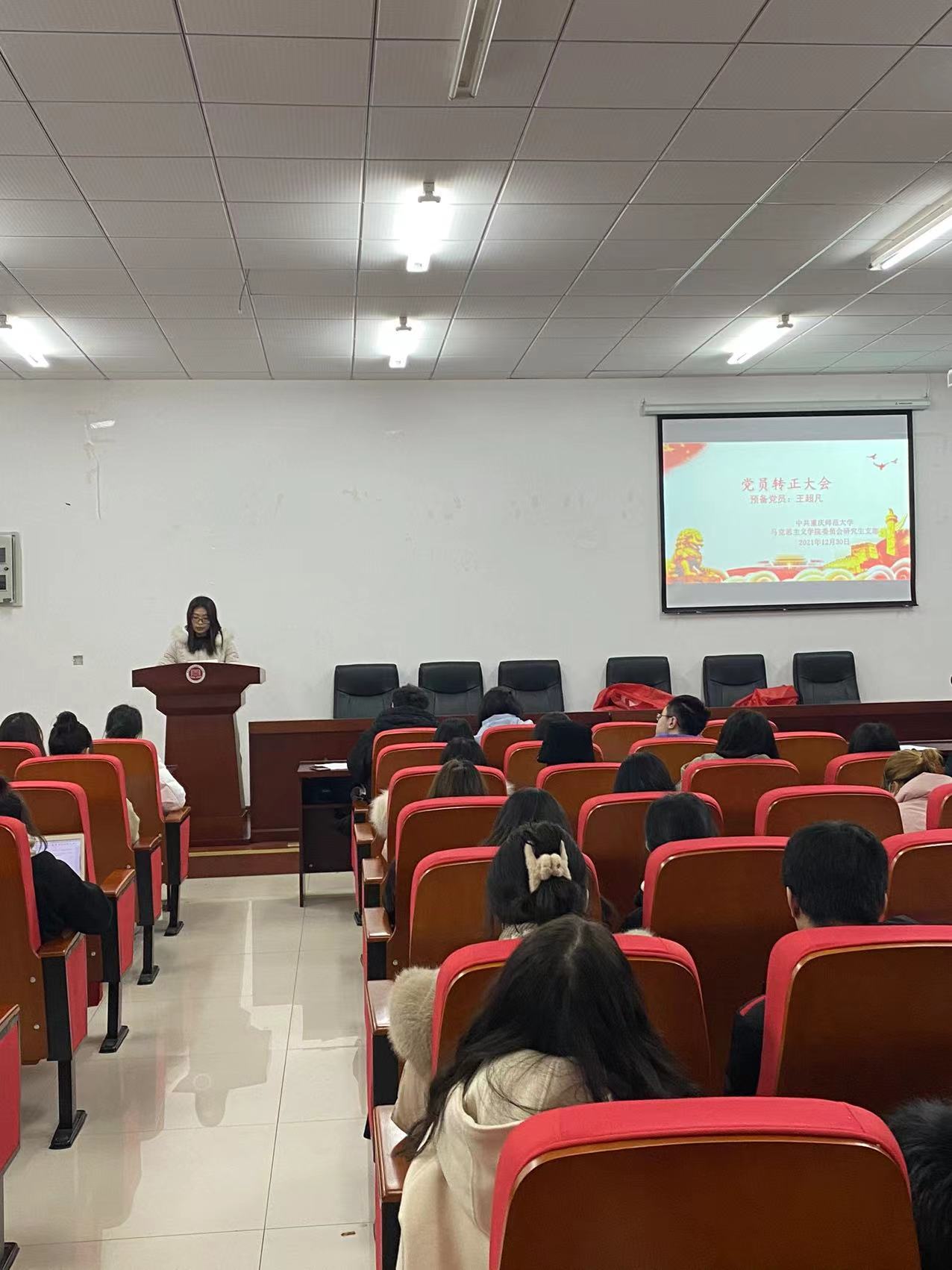 首先,进行了王超凡、雷恬静同志的转正大会,大会严格按照组织程序,对接收两位同志为中共正式党员的事宜进行讨论。两位同志分别就自己在预备期一年的思想上、政治上、学习上、生活上的表现情况向组织进行了汇报。在场党员对王超凡和雷恬静同志在预备期一年的各方面情况发表了自身看法并提出相关建议。大会严格实行表决制,由正式党员采取无记名投票的方式对两位同志进行表决。
