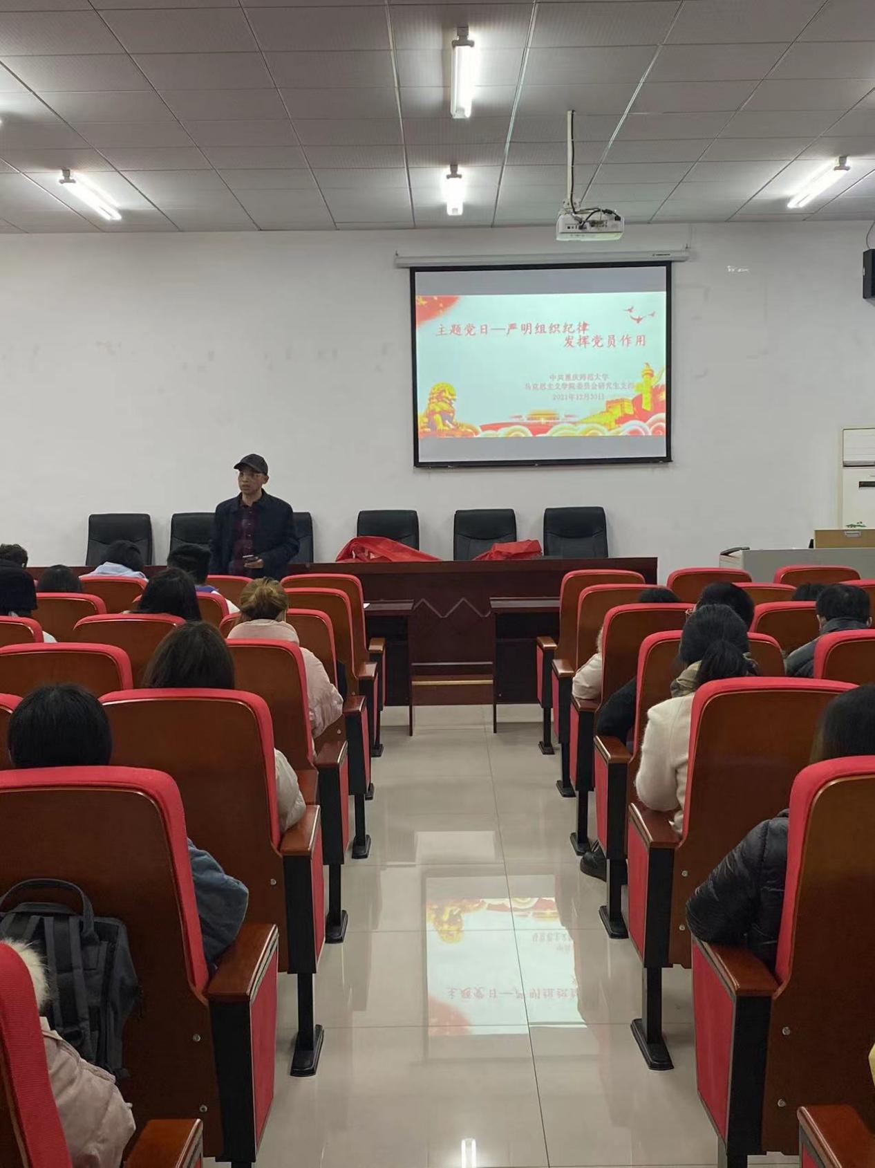 研究生支部于汇贤楼X106教室召开以“严明组织纪律,发挥党员作用。”为题的12月主题党日活动暨党员转正大会,会议由支部书记李剑同志主持。