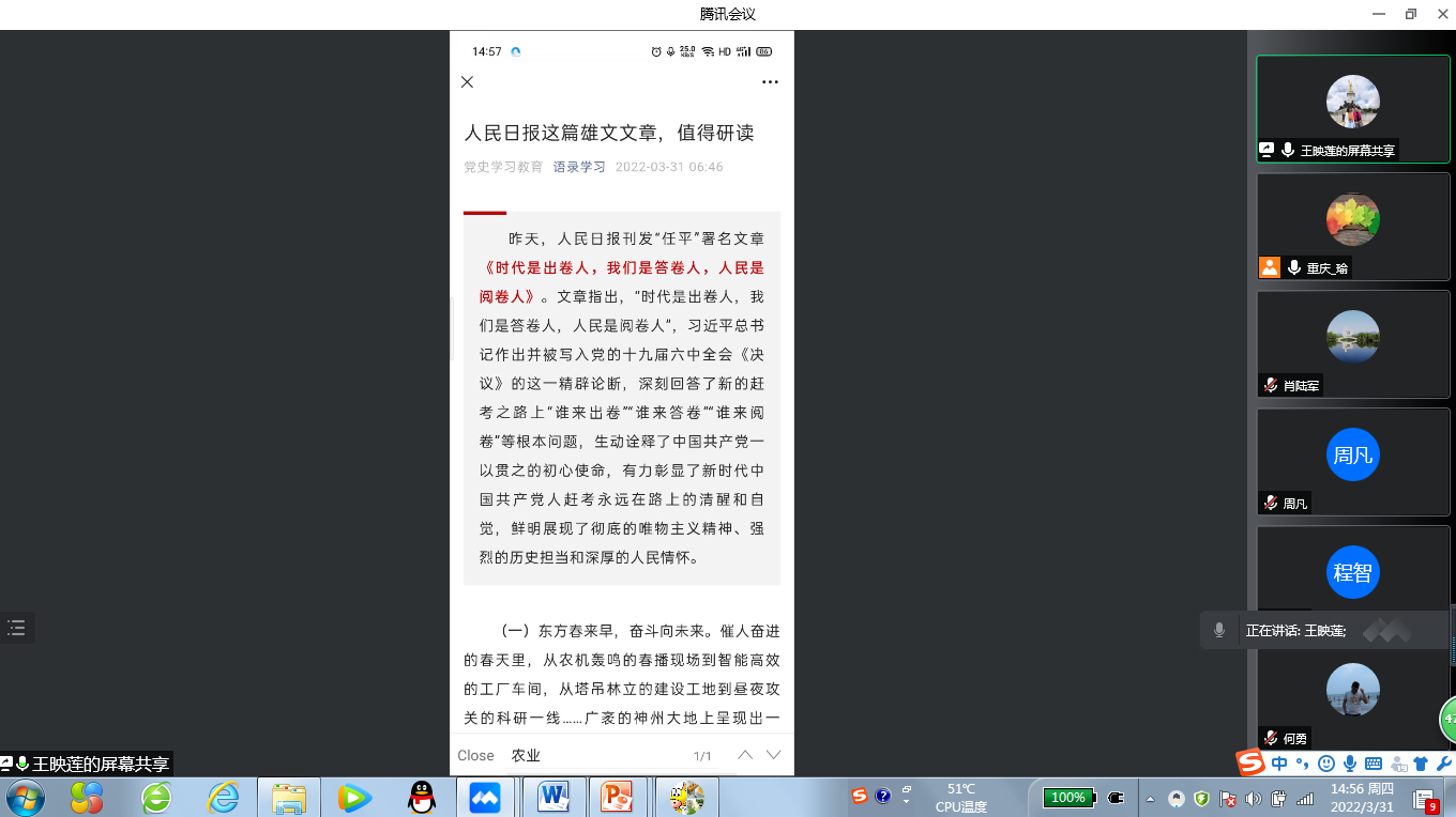 “概论”教研室党支部通过腾讯会议召开线上支部党员大会,组织开展3月主题党日学习活动,重点学习了2022年1月11日习近平总书记在省部级主要领导干部学习贯彻党的十九届六中全会精神专题研讨班开班式上发表的《继续把党史总结学习教育宣传引向深入 更好把握和运用党的百年奋斗历史经验》重要讲话,以及《中共中央国务院关于做好2022年全面推进乡村振兴重点工作的意见》主要精神。会上,彭君君和王映莲两位同志从乡村振兴战略的时代背景、机遇挑战、具体举措和重要意义等方面交流了学习心得,祝玉峰等同志踊跃发言,谈了各自的学习体会。通过学习,全体党员加深了对党的百年奋斗历史以及乡村振兴战略的理解和把握,为进一步提升课堂教学质量打下了坚实的基础。