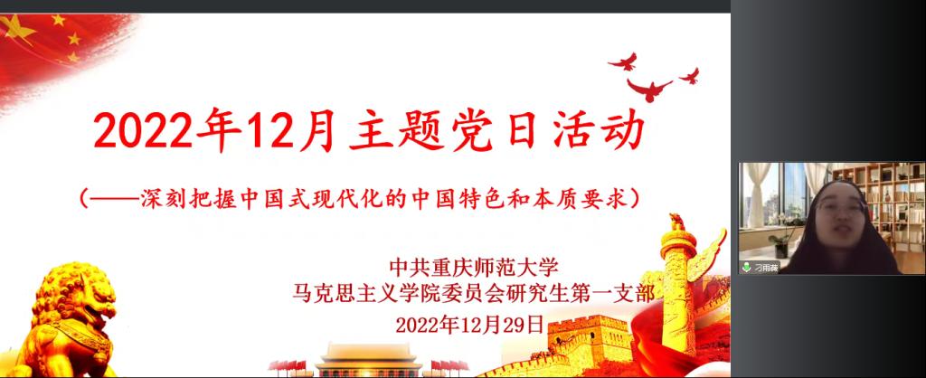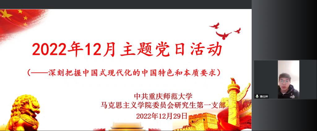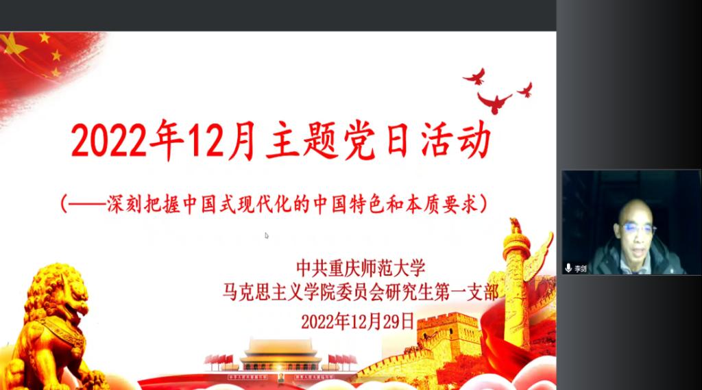 2022年12月29日晚上19点,学院研究生第一支部通过腾讯会议平台开展云端以“深刻把握中国式现代化的中国特色和本质要求”为主题的党日活动,会议由支部书记李剑同志主持。