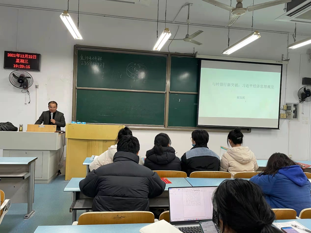 赵玉民副教授以《与时偕行新突破:习近平经济思想概览》为题,以十大内容为纲,全方位地从提出背景、丰富内涵、重要意义等方面为同学们讲解了用新发展理念统领发展全局的理论、推动经济高质量发展的理论和供给侧结构性改革的理论的核心与要义。赵玉民副教授将这些思想和理论产生的原因、时间、背景与在实际生活中的应用相结合,引导同学们更好地去学习和理解习近平新时代中国特色社会主义经济思想。