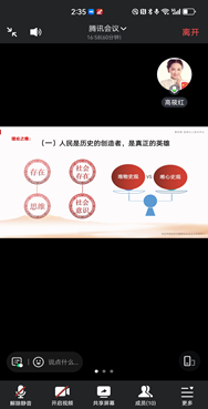 其次,教研室成员对高老师的教学设计和分享过程给予了高度赞赏,也结合自己的教学经历,谈了诸多的感受。如徐琴和仲娜老师谈到要结合所授课班级的专业情况,有针对性地将教材话语转变为学生喜闻乐见的课堂话语。陈波老师建议可摘取教学设计中人民情怀的一两个案例,将其延展开来讲深讲细。蓝天和王超老师建议可多运用学习通来与学生积极互动,在教学内容中融入《爱江山更爱美人》歌曲和“天地之间有杆秤,那秤砣是老百姓”歌词等内容,增强思政课教学的趣味性和有效性。