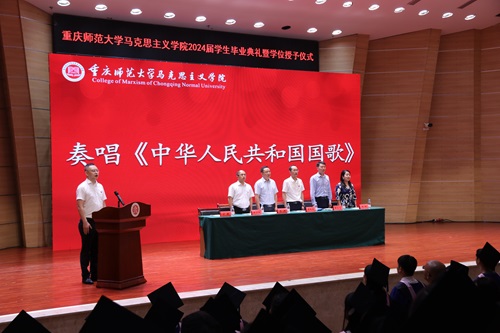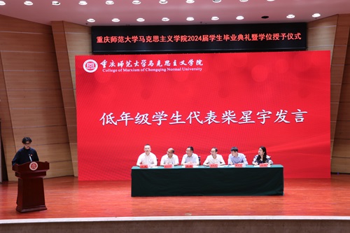 获得了成长、增长了学识、淬炼了思想、筑牢了身为重师马院人的信仰。同时她再次感谢学院全体领导、老师的辛勤付出和言传身教,并承诺全体同学都将牢记重师马院人的身份,矢志不渝地追求人生理想,做“崇德、尚美、博学、笃志”的重师马院人。低年级学生代表柴星宇在对毕业生表达美好祝愿的同时也呼吁低年级学生:一要坚守理想信念、筑牢思想根基;二要陶冶道德情操、锤炼高尚修养;三要涵养扎实学识、练就过硬本领;四要勤修仁爱之心、坚持服务贡献。