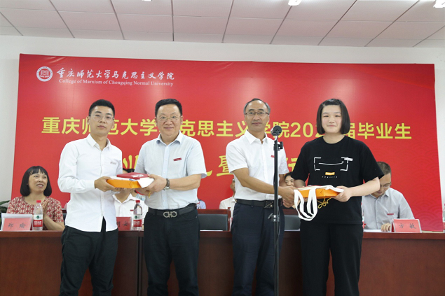 教师代表郑瑜老师用“情怀要深、思维要新、视野要广、要有担当、要敢于作为”对2020届毕业生寄予殷殷嘱托,勉励毕业生们在未来的似锦人生中不断厚积学识,锤炼意志,滋养品德,陶冶情操。低年级学生代表2017级王小桥同学向学姐学长献上最美好的祝福。优秀本科毕业生代表吴晓同学与优秀研究生毕业生代表谭京凤同学表达了对学院领导、老师的感激之情,对同窗情谊的不舍之情以及对未来旅途的坚定信心。院长陈洪代表学院接受2020届毕业生捐赠的爱心基金。党委书记刘军、院长陈洪代表学院向毕业生赠送学院毕业纪念品。