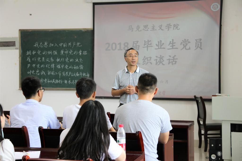 随后,党委书记刘军开展组织谈话。他对毕业生党员提出了三点希望和要求:一是牢记自己的党员身份,时刻用党员标准要求自己,发挥党员应有的价值和作用;二是坚定理想信念,不忘初心,积极践行,在今后的工作岗位上勤奋努力,做事业中的佼佼者;三是坚持学习,保持先进,深刻领会习近平总书记系列重要讲话精神和治国理政新理念、新思想、新战略。最后,刘书记期望:毕业生党员们能够牢记使命、勇于担当,用“青春梦”托起“中国梦”,以优异的成绩为党旗增辉,为母校添彩。