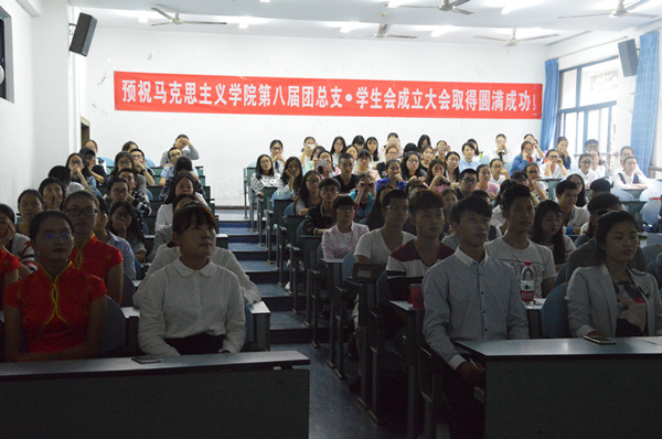 于弘德楼5201举办第八届团总支•学生会成立大会。本次大会特邀校学生会、音乐学院、体育学院等学院主席团成员,团总支书记马小又老师和2016级辅导员刘洪老师出席本次大会,第八届团总支•学生会成员全体参与。