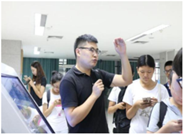 来到检索处,冯老师通过实际操作,为同学们演示了文献资源的检索方法,使同学们可以通过电子设备快速而精确的找到他们自己想要的书籍的位置信息。“移动图书馆是与实体图书馆相匹配的,无论何时何地,只要你想看书、想学习,你都可以通过移动图书馆完成。”在移动图书馆设备面前,冯老师如是介绍着。此外,冯老师还依次为大家介绍了图书馆的存储区和休息室。