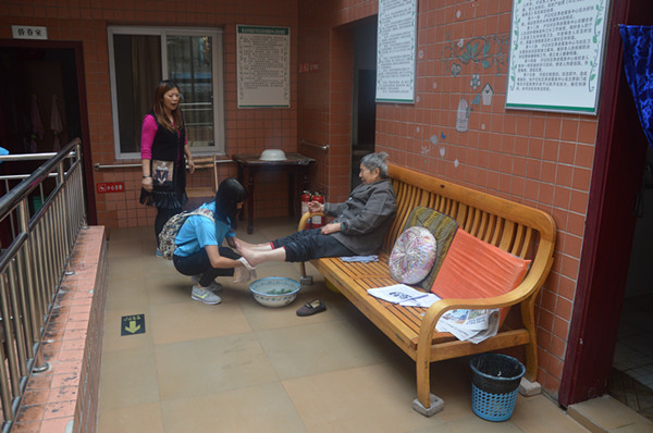 进入养老院的志愿者们分头行事:有的志愿者替老人们打扫屋子、整理零碎物件,贡献自己力所能及的力量;有的则陪伴在老人身旁,聆听老人们讲诉那过去的故事,聊聊老人的生活起居。“我们早上起来散散步、唱唱歌,下午就逛公园打麻将,一天很快就过去了。”一位老奶奶面带微笑地谈到。而其他的志愿者则进入了老人们居住的小房间,为老人剪指甲、削水果,带去志愿者们的关怀与问候。