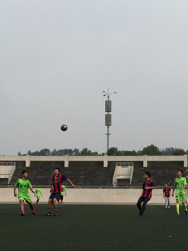 队员也不甘示弱,3号队员将球传给8号,默契配合,却被体育学院21号队员一个反踢,全场呐喊声不断。上半场比赛如火如荼进展着,现场气氛十分热烈。上半场比赛以体育学院暂时领先告一段落。