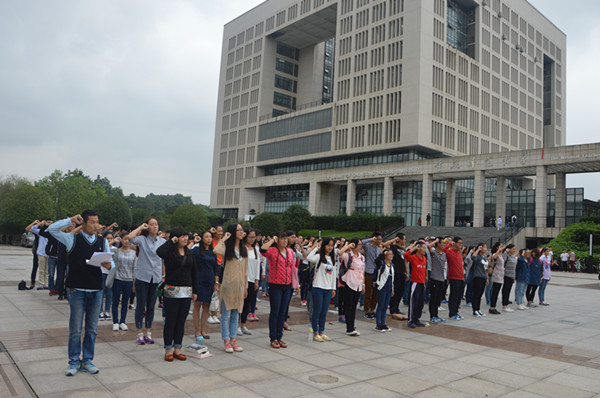 于图书馆孔子铜像前举行2015级师范生宣誓活动。团总支·学生会办公室副主任方太坤领誓并组织活动。