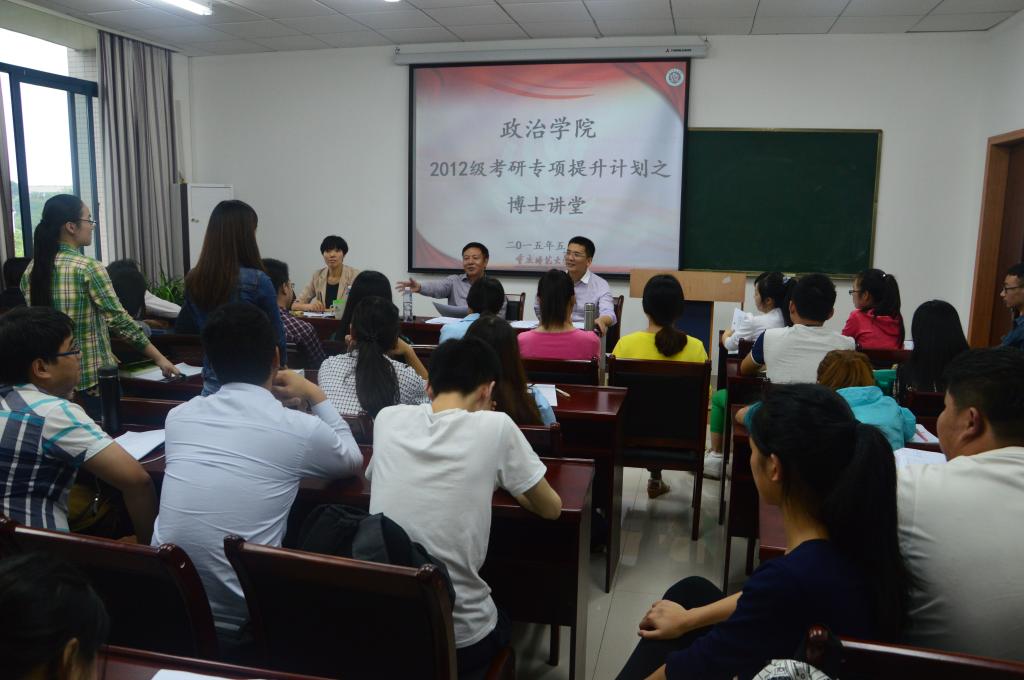 胡政武博士、阮李全博士担任主讲人,团总支书记马小又老师出席活动,2012级全体考研学生参与。