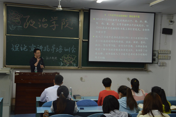 随后,陈洪院长围绕《习近平谈治国理政》一书,从为什么要学习该书、怎么学习和学习时注意的问题三个方面展开培训。他指出该书是习近平总书记富有创见性的新思想、新观点、新论断、新要求。在新阶段下,国家领导人认清了中国特色社会主义和马克思执政党建设两大规律。更引用习近平总书记对青年的希望:当代大学生是可爱、可信、可贵、可为的,激励同学们奋发向前。最后,陈院长给同学们指出了在学习理论精神时应注意的系列问题,使得同学们受益匪浅。