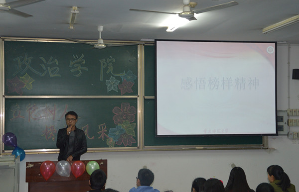 2013级、2014级分别于2015年4月6日18:00和2015年4月6日20:00,在弘德楼5201教室开展以“立德树人·榜样风采”为主题的班会活动。辅导员张晓庆出席,2013级、2014级全体同学分别参与。