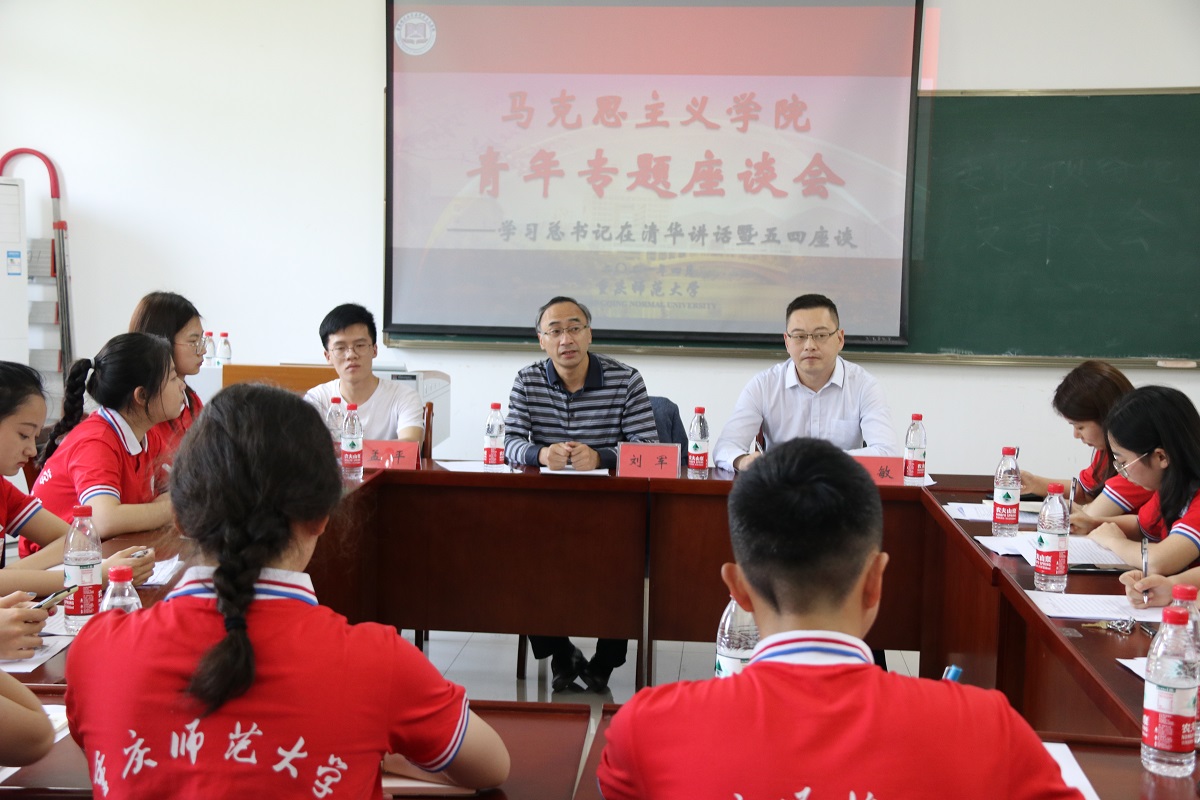 于汇贤楼309会议室举办以“传承五四精神,勇担时代使命”为主题的学习习近平总书记清华讲话暨“五四”青年座谈会。学院党委书记刘军、党委副书记方敏出席,教师代表、各年级学生代表参会。