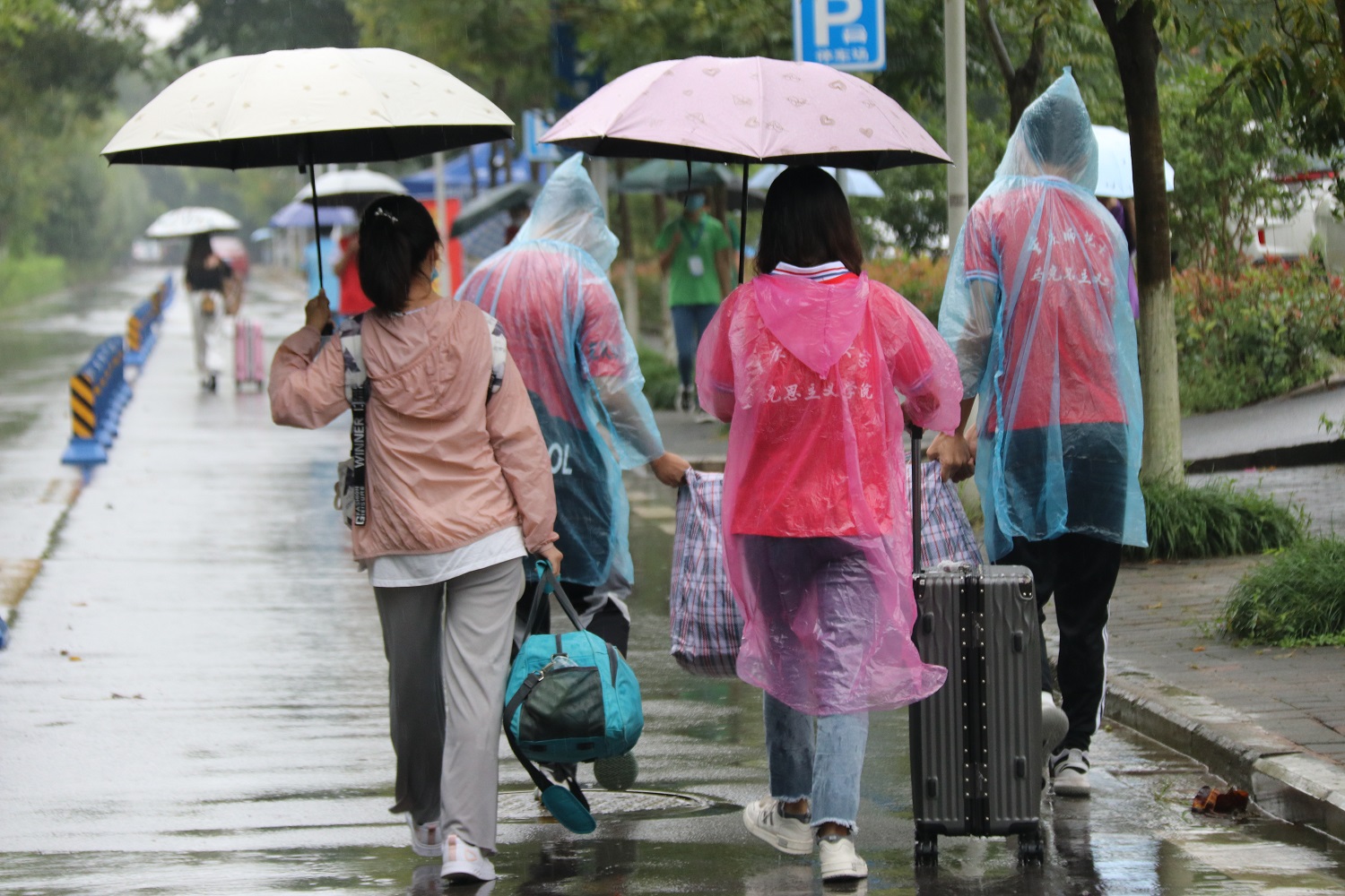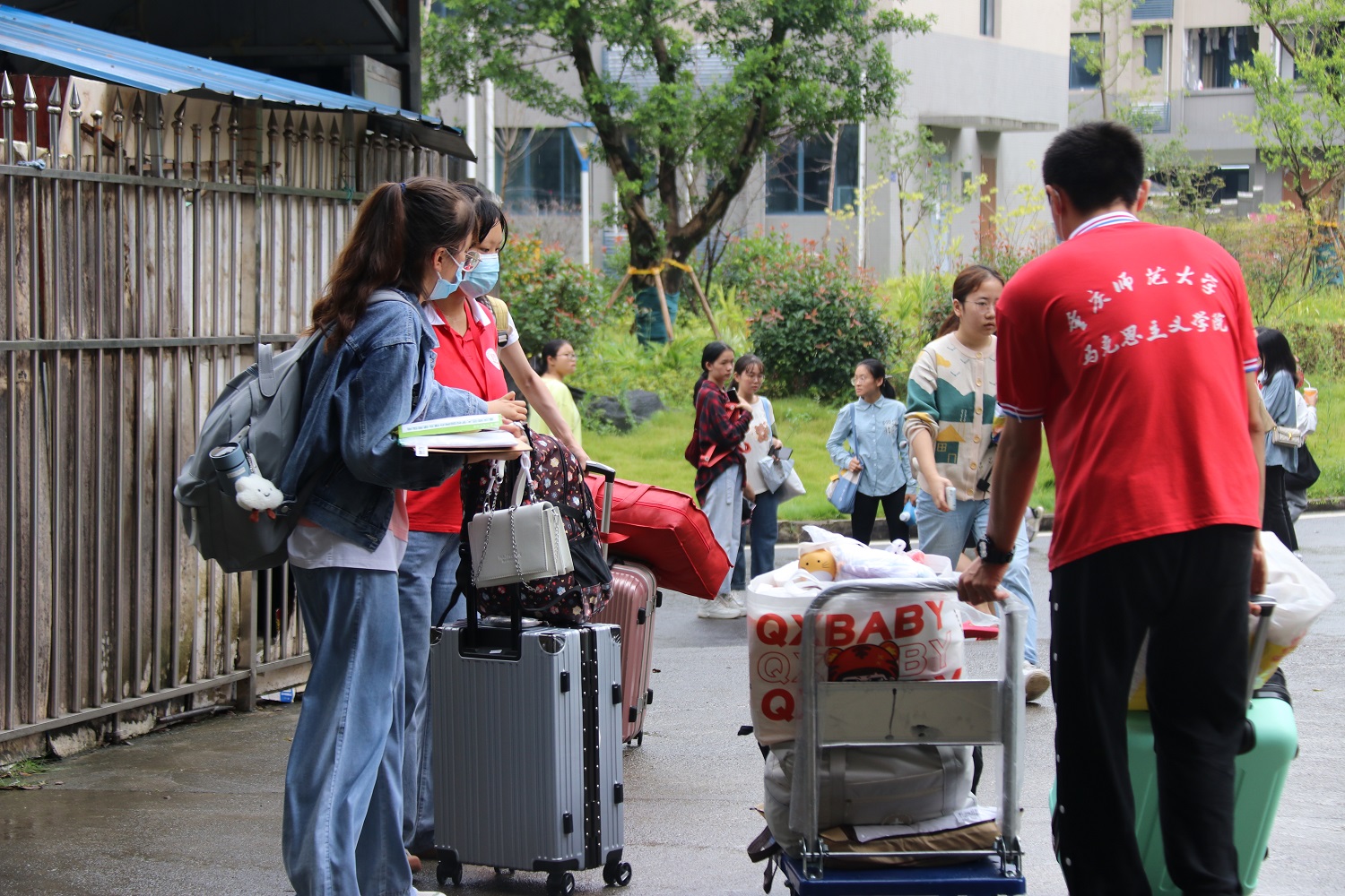 在志愿者们的带领下,新生们来到学院报到点,在迎新站办理好手续后,由志愿者点对点帮助新生搬运行李,带领他们进入宿舍,完成报到的所有流程。