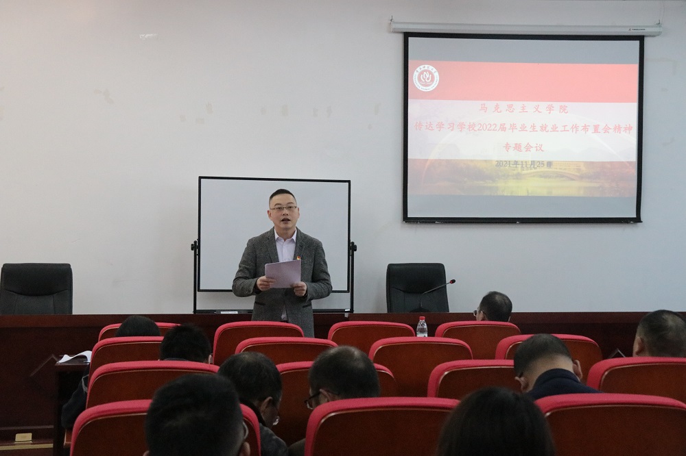 于汇贤楼106教室开展传达学习学校2022届毕业生就业工作布置会精神专题会议。本次会议由学院党委副书记方敏主持。学院全体教职工参与会议。