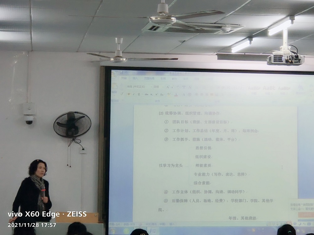 接着,马老师提出学生干部要明确工作角色定位,要扮演好服务角色,模范角色,领导角色,发挥好先锋模范作用。同时也要明确岗位职责,在其位谋其政,任其职尽其责。学生干部在对待工作上要态度认真,尽职尽责。