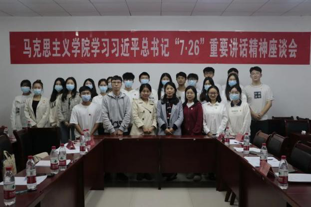 特于汇贤楼309会议室召开学习习近平总书记“7·26”重要讲话精神座谈会。院党委书记李晓燕、副院长姜土生、分团委书记刘洪、2020级辅导员苏泓予、2021级辅导员桑子豪出席本次座谈会。学院学生骨干代表、各年级学生代表到场认真学习。