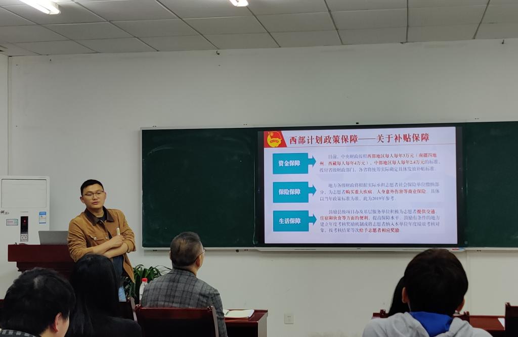 孙玖江老师围绕西部计划项目概况、服务地区、服务内容、招募流程四个部分,着重介绍了西部计划项目基本情况、报名条件及流程、选拔标准、基本政策保障、志愿者服务管理等内容,并针对西部计划的报名工作、岗位分配、服务期满后的优惠政策等相关问题进行了详细解读。最后,孙玖江老师针对同学们的疑惑对西部计划的政策进行了再次解读,宣讲会起到了良好反响。孙老师鼓励大家明确目标、提高站位,审慎思考、大胆前进,并祝愿同学们找到理想的工作。