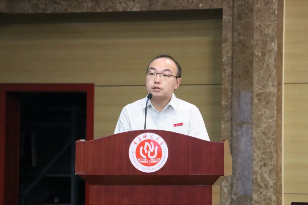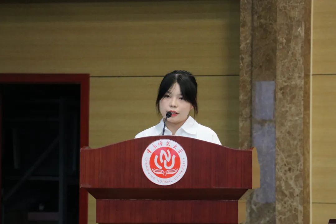 议程第二项:教师代表陈沉老师发言。陈沉老师首先对2023级新生的到来表示热烈欢迎,并希望各位新生明白大学之根本在“学”,专业之根基在“信”,事业之根源在“行”,并祝愿新生能够在大学之学的根本上自信,在专业自信的根基上笃行,努力践行“学高为师、身正为范”的重师校风。
