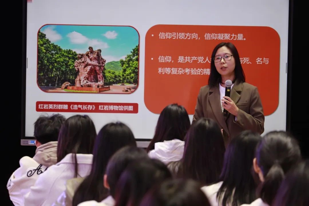 邵二辉老师进行“信仰之光”课堂分享。邵二辉老师首先以“提起红岩精神,你能联想到什么?”的问题为导入,指出红岩精神的培育和形成经历了中共中央南方局、重庆谈判、歌乐山英烈群体三个重要的历史阶段,并在此基础上讲解了红岩精神的内涵。最后,邵二辉老师从三个方面揭示了红岩烈士伟大的精神品质:一是在生与死中捍卫信仰;二是在名与利的诱惑中坚定信仰;三是在敢于善于斗争中笃行信仰。课堂秩序井然,极具互动性和启发性,激励当代大学生要承担起自己的时代责任,以青春之我,耀信仰之光。邵二辉老师凭借逻辑清晰的教学环节、丰富多彩的教学活动和优秀的教学设计获得在场师生的广泛认可与好评,充分展现出重师马院教师深厚的文化底蕴、娴熟的授课技巧以及高尚的爱国情怀。