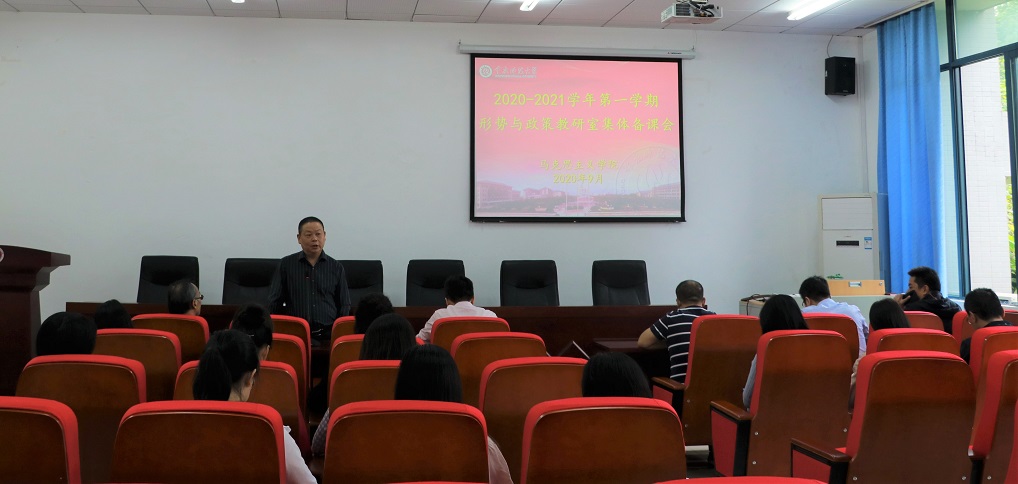 2020年9月29日上午10点,2020——2021学年度上学期“形势与政策”集体备课会在汇贤楼106学术报告厅召开。学院党委书记刘军、副院长况明安、形势与政策课程教研室负责人和全体任课教师参会,会议由教研室主任赵玉民主持。