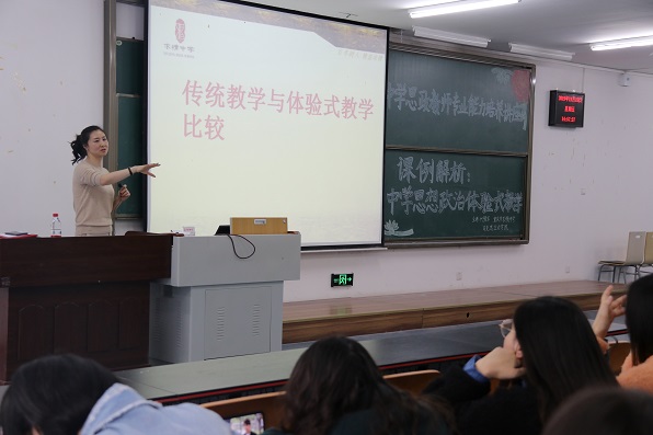 首先,为让同学们对“体验式教学”有更为深入地理解,代老师结合自身教师职业生涯的经验,从教师主导、学生积极参与、加深学生印象和保持师生和谐关系方面入手,深入浅出地让同学们了解 “体验式教学”的含义和实施条件。接着,代老师将“体验式教学”与“传统教学”进行了比较,针对“传统教学”的课堂中普遍存在的浅表式教学和教学效果的片面性问题作了详细地分析,让同学们对实施“体验式教学”的必要性有了更加深刻的认识。她强调,就“体验式教学”的教学方法和教学设计而言,学生自身体验和对知识的生成性是教学重点。